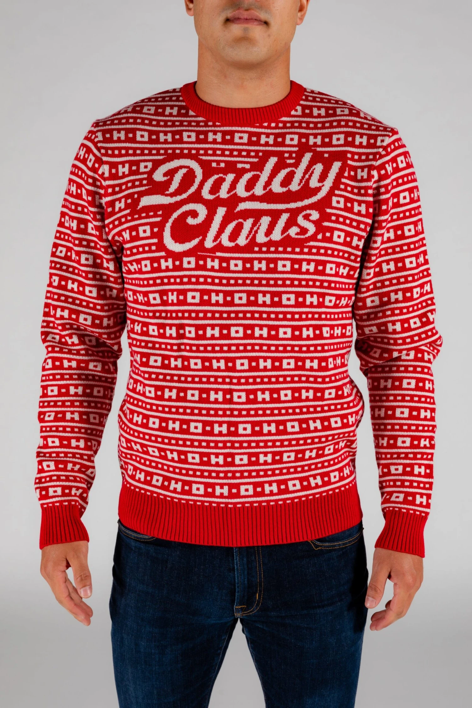 Santa wasn’t always old, fat and grey. Oh no. Santa used to be a total stud. He was young, hot and fertile. He rode a Harley and only wore red leather. Women would swoon, men would fight, drinks would always be on the house. He truly is the man, the myth, and the legend. You know him now as Old St. Nick, but back then, the ladies liked to call him Daddy Claus. Get this red ugly Christmas sweater in memory of the hero of the holiday season.